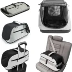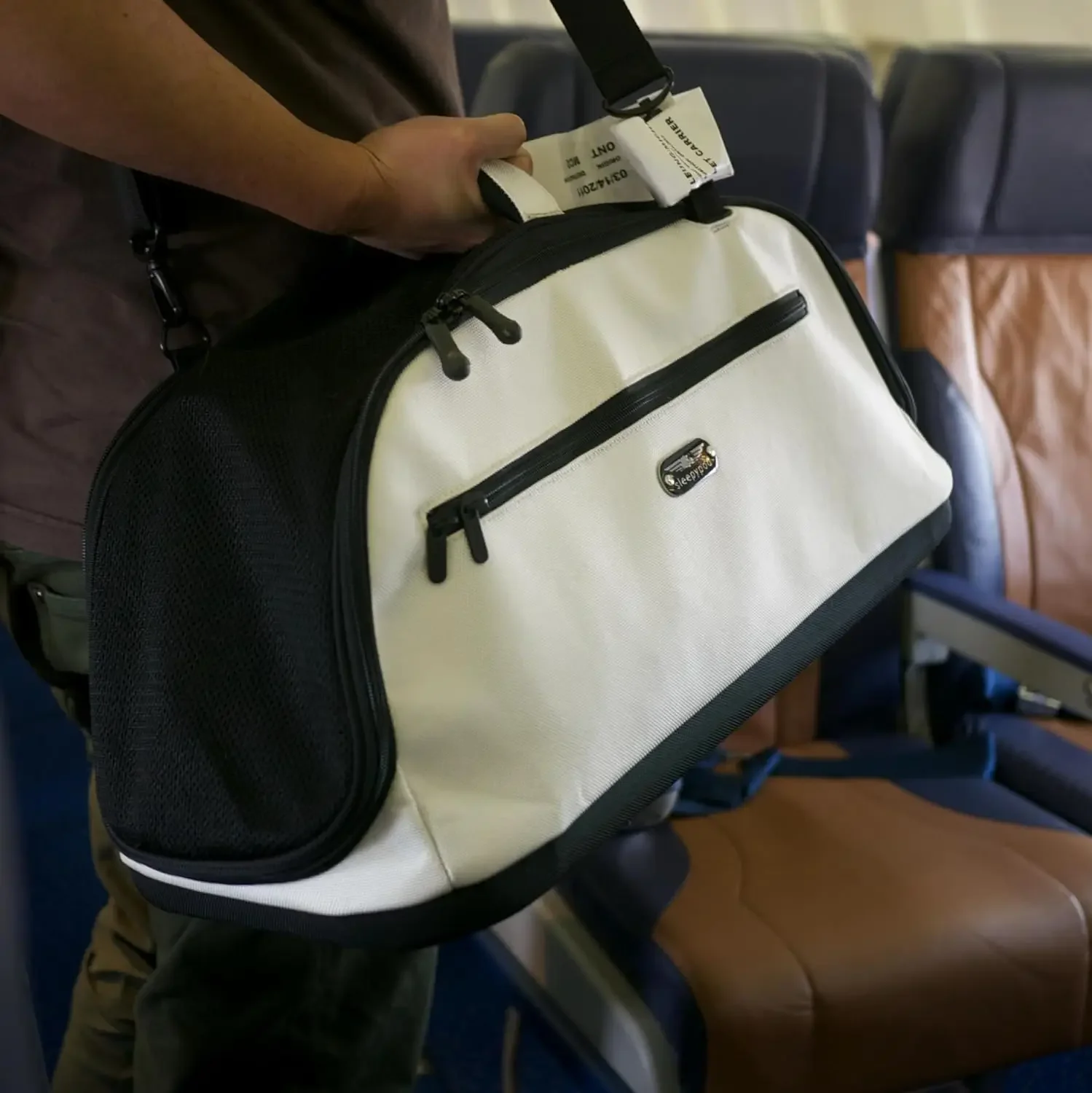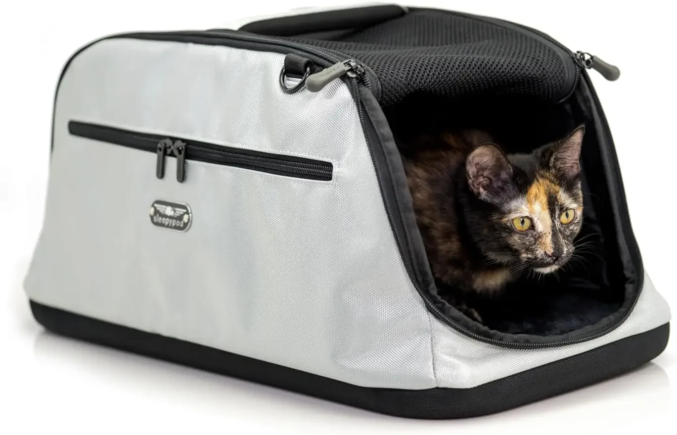 This is a revolutionary carrier that redefines in-cabin pet travel. Air adapts to the various under-seat storage requirements set by different airlines while providing maximum comfort for your jet set pet. Worrying about buying a carrier that will not fit under a plane seat is a thing of the past. Our patent pending folding system allows pets to travel in the largest space possible while the airplane is in the air, yet still allows for stowage under an airline seat during takeoff and landing. When the captain says you can recline your seat, rotate the carrier so it is between your feet and expand the ends so both you and your little friend can stretch out comfortably for the duration of the flight. In-cabin pet travel has never been so comfortable. Straps on both sides allow you to secure the carrier in your car. A pass through pocket allows you to secure it to the telescoping handle on carry-on luggage.